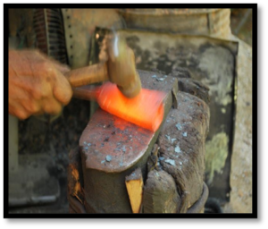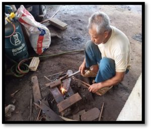 โดยขั้นตอนแรกนั้น เริ่มจากการเลือกชนิดของเหล็กที่จะใช้ จากนั้นออกแบบด้วยการวาดแบบที่ต้องการจากชอล์กขาว เช่น มีดพร้า ขวาน เคียว ที่ปอกมะพร้าว มีดกรีดยาง จอบเสียม และตัดตามแบบด้วยเครื่องตัดเหล็กและเชื่อมส่วนต่างๆเข้าด้วยกัน จากนั้นนำไปเผาและตีจนได้ตามแบบที่ต้องการ โดยใช้เวลาในการทำประมาณ ๑ ชั่วโมง ต่อ ๑ ชิ้นงาน และตกแต่งให้สวยงามโดยการเจีย จากนั้นล้างน้ำและชุบด้วยน้ำมันเครื่องใช้แล้วเพื่อเพิ่มความคมและสวยงาม