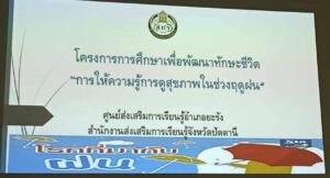นางสาวไรวินท์ พลเพชร ผอ. สกร. อำเภอยะรัง ได้มอบหมายให้ นายกามารูซามัน เบณมะ พร้อมด้วยทีมงานการศึกษาต่อเนื่อง งานการศึกษาเพื่อพัฒนาทักษะชีวิต ดำเนินจัดกิจกรรมโครงการการศึกษาเพื่อพัฒนาทักษะชีวิต”ให้ความรู้การดูแลสุขภาพในช่วงฤดูฝน” โดยมีกลุ่มเป้าหมายจำนวน 20 คน เพื่อให้มีความรู้ความเข้าใจเกี่ยวกับการดูแลสุขภาพในช่วงฤดูฝน พร้อมทั้งนำความรู้ไปประชาสัมพันธ์ในครอบครัว และชุมชน อีกทั้งได้สอดแทรกความรู้เกี่ยวกับการดูแลสุขภาพของผู้สูงอายุอีกด้วย
